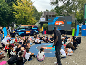 Zunächst rollte ein riesiger Tross aus Bussen, Autos und Technik-Lastern an. In Windeseile gelang es dem 40-köpfigen logo!-Team dann, den Parkplatz in ein professionelles TV-Set zu verwandeln. Scheinwerfer, Kameras und eine Bühne ließen den Platz in einem ganz neuen Licht erscheinen.